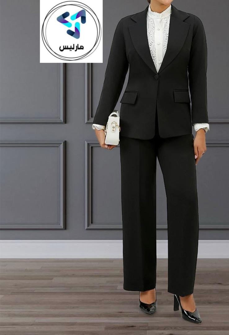 کت و شلوار زنانه مارلیس مشکی جنس مازراتی تمام آستردار قد کت 70 سانتی متر قد شلوار 107 سانتی متر
